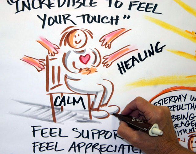 People respond to the hands-on immediacy of strategic visuals. Rather than passively hearing a lecture or seeing a PowerPoint presentation, participants are literally “drawn in” by the visual and metaphoric language of large murals. When they see the meeting content visualized, whether captured from a presenter or a group discussion, participants become more active in listening, reflecting, and contributing. The visual practitioner depicts the synergy of the group.