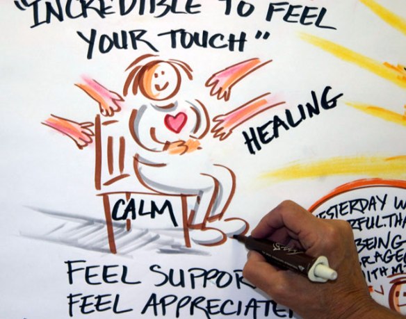 Murals drawn in real time as meetings progress are an excellent way to capture the “Big Picture.” Particularly useful in envisioning and strategic planning processes, murals get everyone “on the same page.” Visuals structure thinking outside of parameters that often impeded innovation. The practitioner captures individual comments as well as “group thinking,” which may be felt and sensed in the room, but not clearly articulated by any one person.