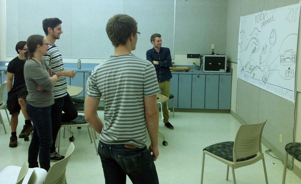 AIGA senior design students at a California State University learn visual facilitation skills in a workshop. Working in pairs, the participants elicited “Dream Day Designs” (future state thinking) from one another as I guided the facilitators in questioning, listening, use of metaphor, and other techniques honed by successful visual practitioners.